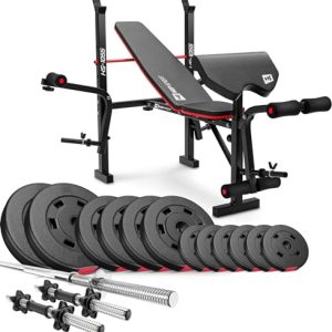 HOP-SPORT® Banc de Musculation Pliable Multifonction HS-1055 Pupitre de Curl, Papillon, Presse jambes et Set d’haltères de 38 kg, Disques de poids en plastique alésage 31 mm et barres d’haltères, Noir
